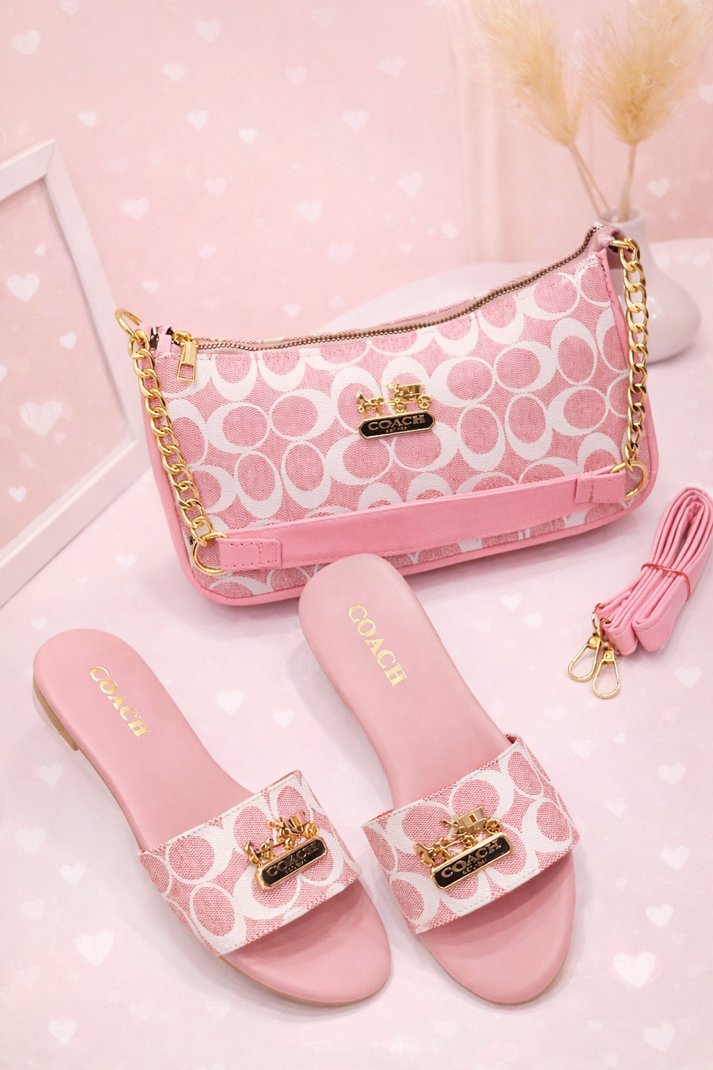 Pink Perfection Duo brings effortless elegance in a perfectly matched set. Featuring a chic pink monogram crossbody bag with gold-tone accents and coordinating slide slippers, this duo blends feminine charm with everyday comfort.